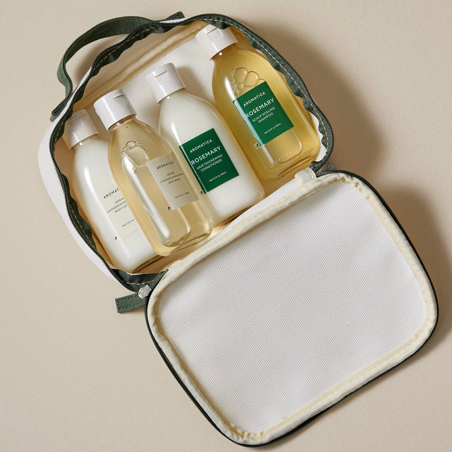 Disfrute de sus elementos esenciales favoritos de AROMATICA en cualquier lugar con este kit de viaje compacto, perfecto para un cuero cabelludo fresco, cabello limpio y piel calmada incluso sobre la marcha.