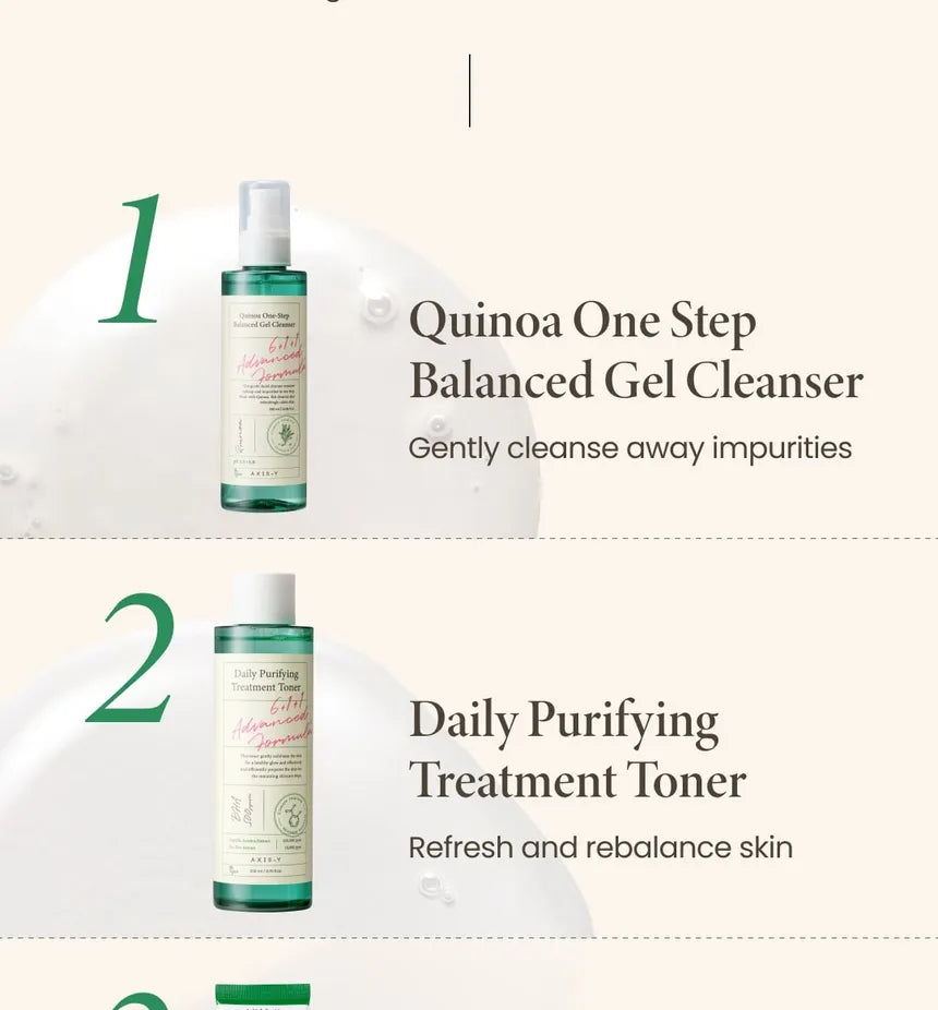 Paso 1-3: Limpiador en gel equilibrado de quinua en un paso 1,5 ml + tónico de tratamiento purificador diario 1,5 ml + suero de brillo corrector de manchas oscuras 1,5 ml
