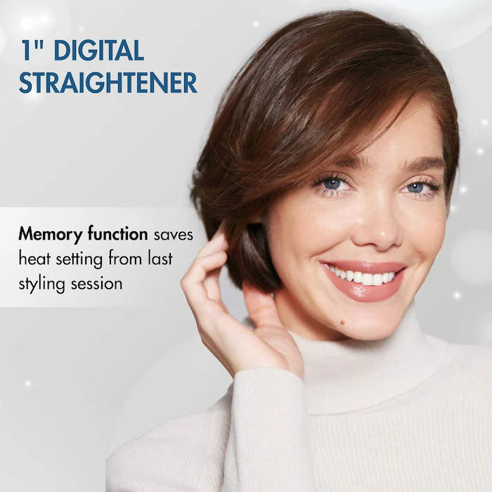 Una plancha digital de una pulgada con una función de memoria que ahorra tiempo para almacenar los ajustes de calor utilizados con frecuencia para mayor comodidad.