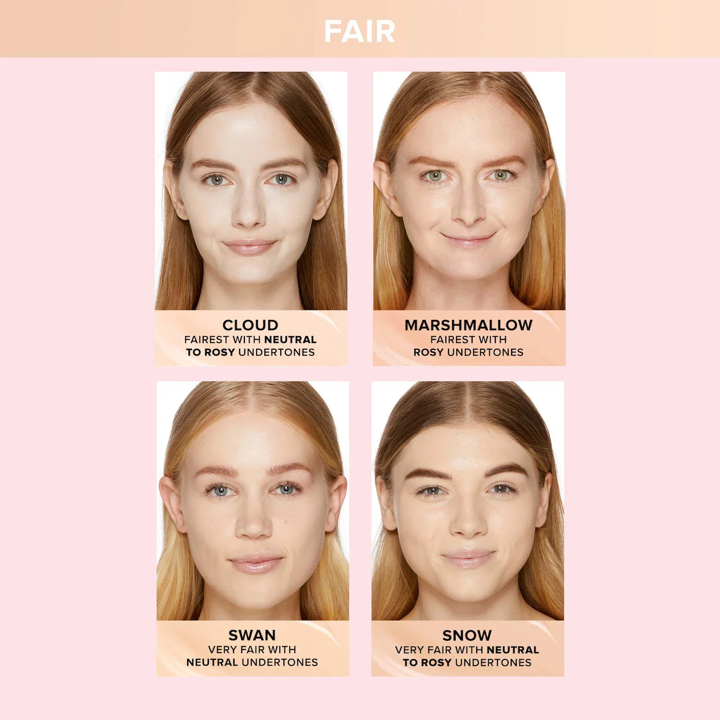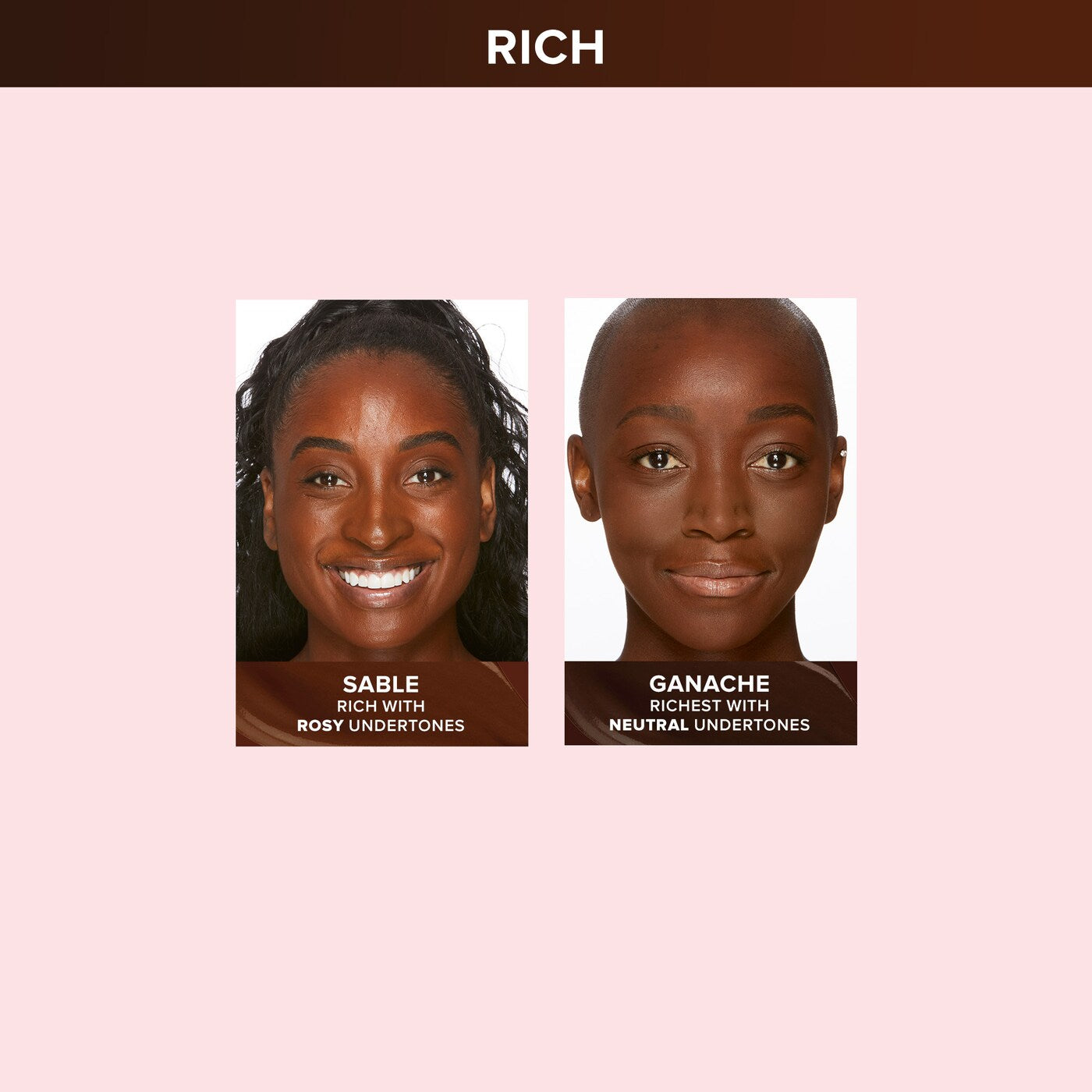 Qué es: Una fórmula líquida hidratante, de cobertura completa, ingrávida, cuatro en uno que oculta, contornea, resalta y retoca en una amplia gama de tonos impecables.