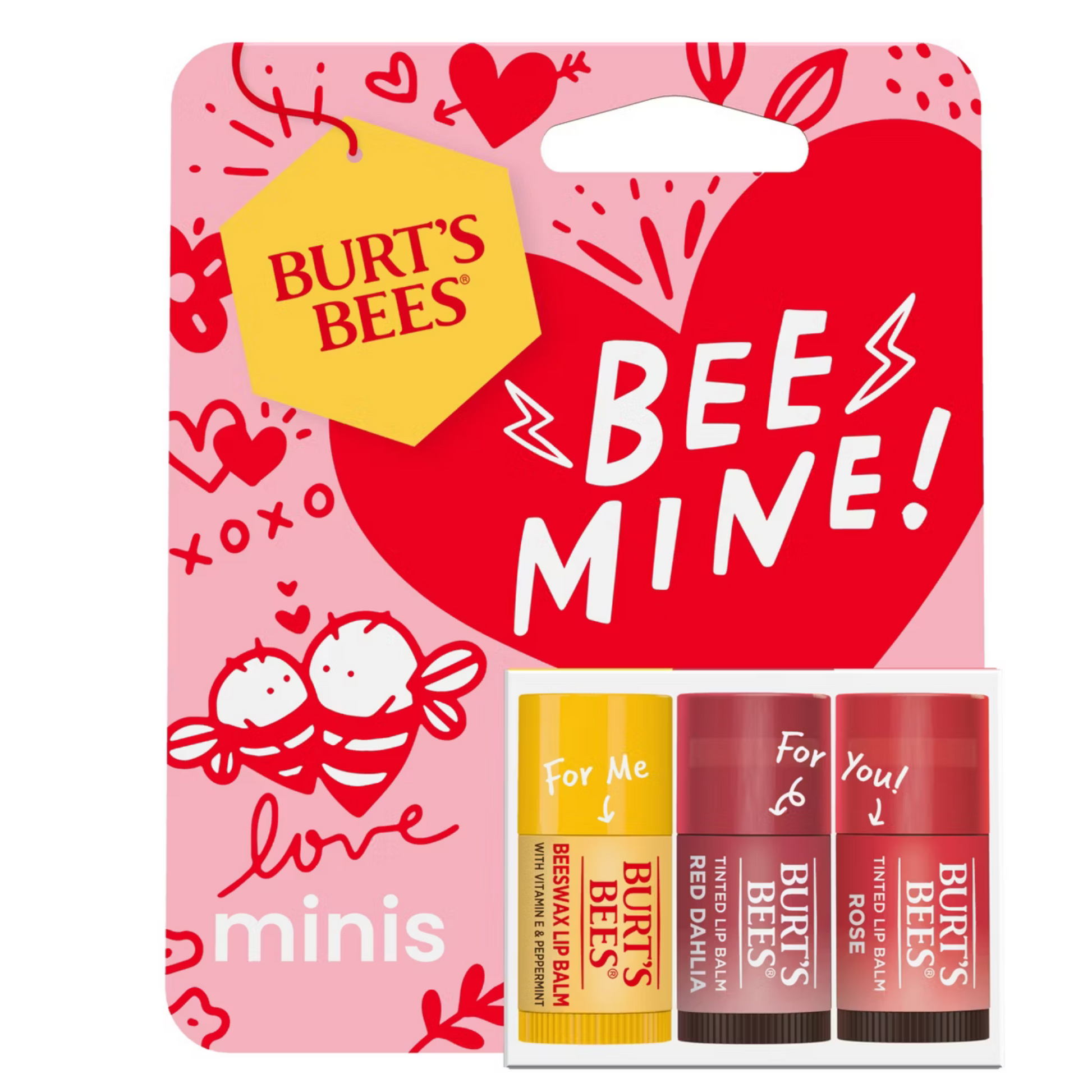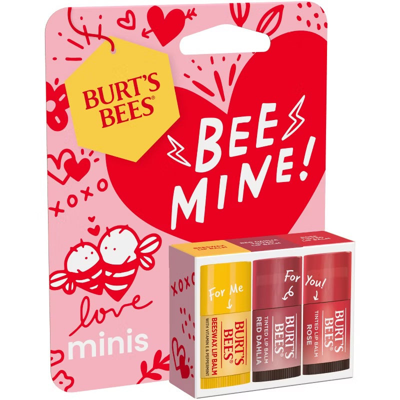 PEQUEÑOS REGALOS PERFECTOS PARA EL DÍA DE SAN VALENTÍN PARA ELLA: Un paquete de 3 mini bálsamos labiales de Burt's Bees en un set de regalo de San Valentín deliciosamente empaquetado que es ideal para compartir con amigos