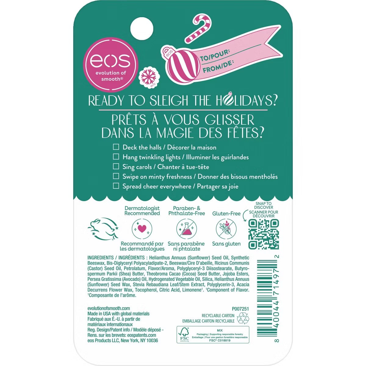 ¿Listo para el trineo de las vacaciones? El eos Candy Cane Swirl Super Balm es un clásico dulce y helado, con sabor a chocolate blanco derretido y bastones de caramelo triturados. Este bálsamo ultrahidratante funciona con mantecas de karité, cacao y aguacate para calmar y suavizar los labios agrietados sin pegarse. Recomendado por dermatólogos y hecho para pieles sensibles, es imprescindible para el cuidado del invierno y el sabor de temporada en un solo deslizamiento suave.