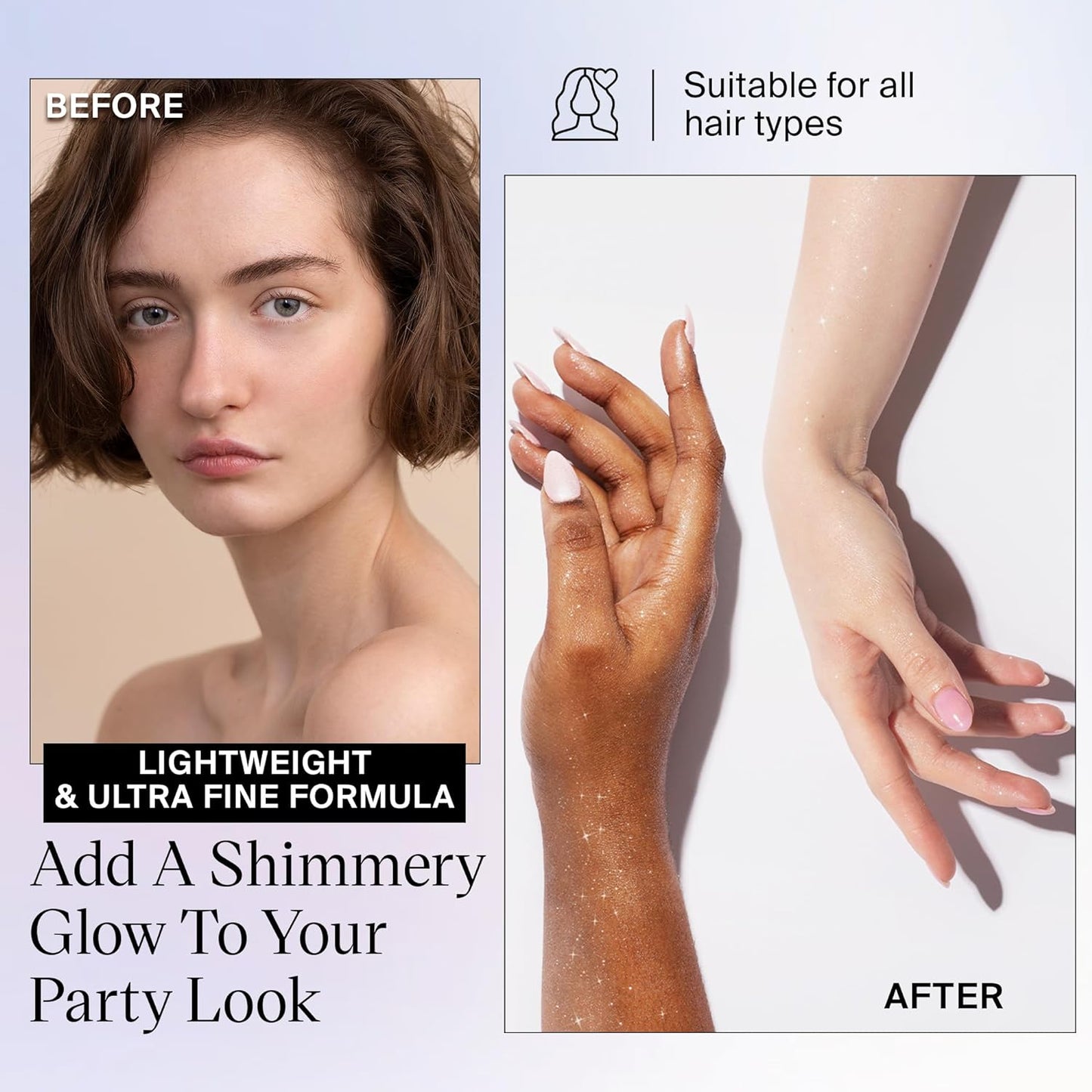 - Fácil de aplicar: añade este spray de purpurina para cabello y cuerpo. Agita este spray de purpurina y luego rocía de 6 a 8 pulgadas de distancia. Capa y construye para lograr el nivel de brillo deseado. Ten en cuenta que el brillo puede transferirse a la ropa.