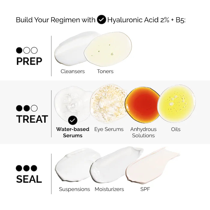 El ácido hialurónico 2% + B5 es una fórmula a base de agua que combina moléculas de ácido hialurónico de bajo, medio y alto peso molecular y un copolímero cruzado de HA de próxima generación para apoyar la hidratación en múltiples capas de la piel. También se dirige a la aparición de arrugas e irregularidades de textura. Además, utiliza la provitamina B5 para mejorar la hidratación en las capas externas, lo que resulta en una piel más suave y regordeta.