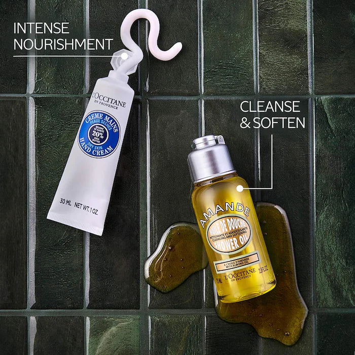 Qué más necesitas saber: Este dúo decadente presenta el aceite de ducha de almendras más vendido. Transformándose de un aceite a espuma lechosa con agua, disfrute de un aroma delicioso y limpie sin resecar la piel. Traiga los beneficios suavizantes de la almendra sobre la mano con la crema de manos de manteca de karité.