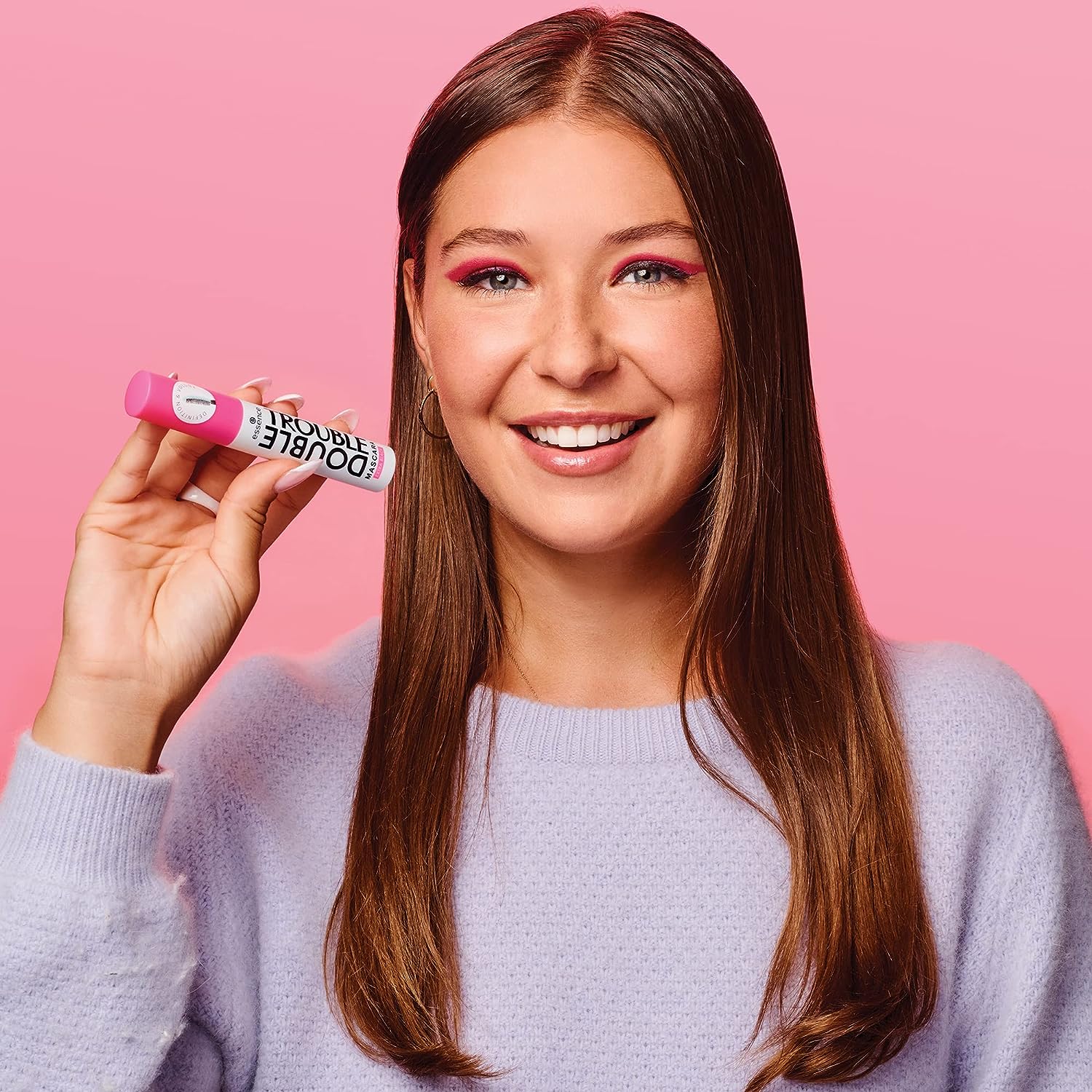 ¡El doble de volumen, el doble de problemas! Essence DOUBLE TROUBLE MASCARA es audaz, atrevida y tiene un cepillo de doble cara para un aspecto de pestañas que lo tiene todo. ¡El aplicador tiene dos lados, un cepillo de elastómero y un cepillo de fibra para una definición, rizo y longitud extremos!.