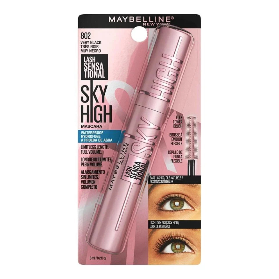 Maybelline Lash Sensational Sky High Waterproof Mascara Makeup, Very Black, ¡impacto de pestañas Sky High desde todos los ángulos! La máscara de pestañas Lash Sensational Sky High ofrece un volumen completo y una longitud ilimitada. El exclusivo cepillo de máscara de pestañas Flex Tower se dobla para volumizar y extender cada pestaña desde la raíz hasta la punta. Fórmula de máscara de pestañas impermeable infundida con extracto de bambú y fibras para pestañas largas y llenas que nunca se cargan. Disponible en negro muy negro y marrón. Alergia probada. Oftalmólogo probado. Adecuado para ojos sensibles y usuario de lentes de contacto. Se elimina fácilmente con el desmaquillante de ojos a prueba de agua.