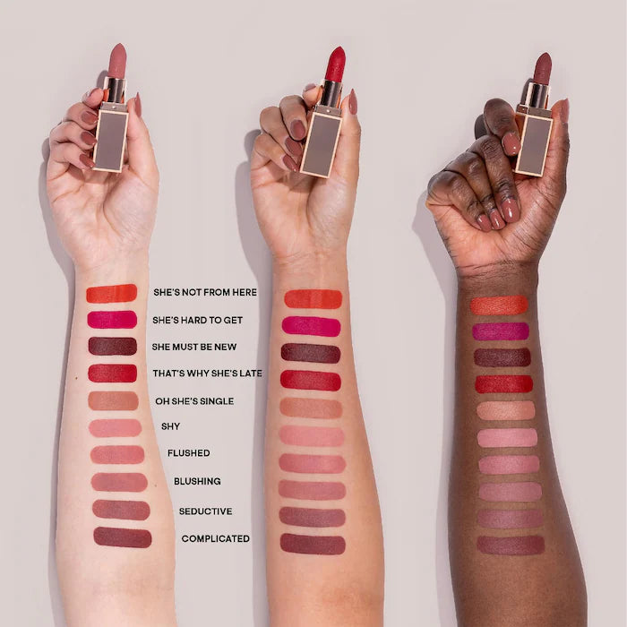 - Difusores ópticos: Crea un acabado mate y borroso sin sentirse seco. Un lápiz labial mate completamente cargado de pigmento, que proporciona un uso duradero.