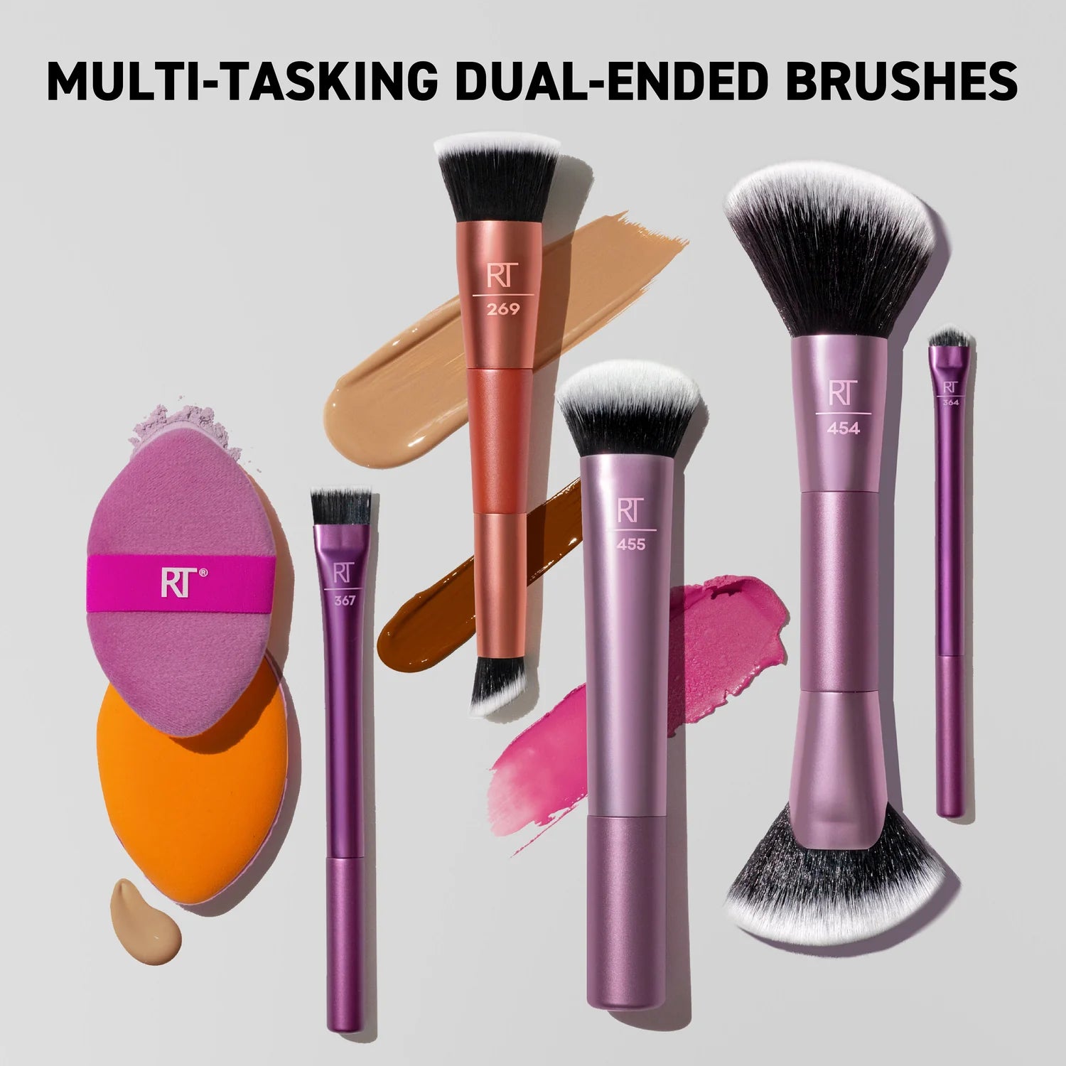 El Real Techniques Big Blends Energy Makeup Brush + Dual-Sided Puff Set cuenta con 9 herramientas multiusos diseñadas para una colocación precisa y el máximo control del color. El juego de brochas de maquillaje incluye el pincel de acabado en ángulo 454, el cepillo de rubor de pata de gato 455, el cepillo de delineador de pirámide 364, el cepillo de ojos de 367 capas + delineador, el cepillo de corrector plano + contorno 269 y el puff de polvos 2 en 1 milagroso. Estas brochas de maquillaje profesional se pueden usar con todos tus productos favoritos en crema y polvo. El puff de maquillaje en polvo tiene dos lados para mezclar sin esfuerzo fórmulas líquidas, de crema y en polvo. Ambos lados de la bocanada de maquillaje se usan mejor secos. Nuestra forma patentada de precisión de 2 puntos está expertamente inclinada para llegar a todas las áreas de la cara, como debajo de los ojos y alrededor de la nariz. El Big Blends Energy Set es fácil de limpiar con nuestro gel de limpieza profunda Real Techniques Miracle. También es 100% libre de crueldad, vegano y está diseñado con la revolucionaria tecnología de espuma sin látex.