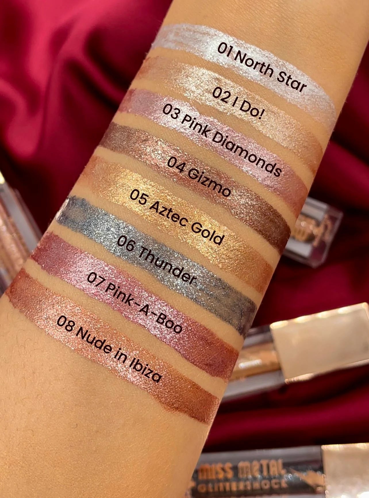 Nuestras sombras de ojos líquidas Miss Metal Glittershock te sorprenderán con su deslumbrante mezcla de brillo y pigmentos de perlas. Cada tono está inmensamente pigmentado, diseñado para bloquear el brillo y durar todo el día sin secarse. Dale glamour a tu look y prepárate para brillar.