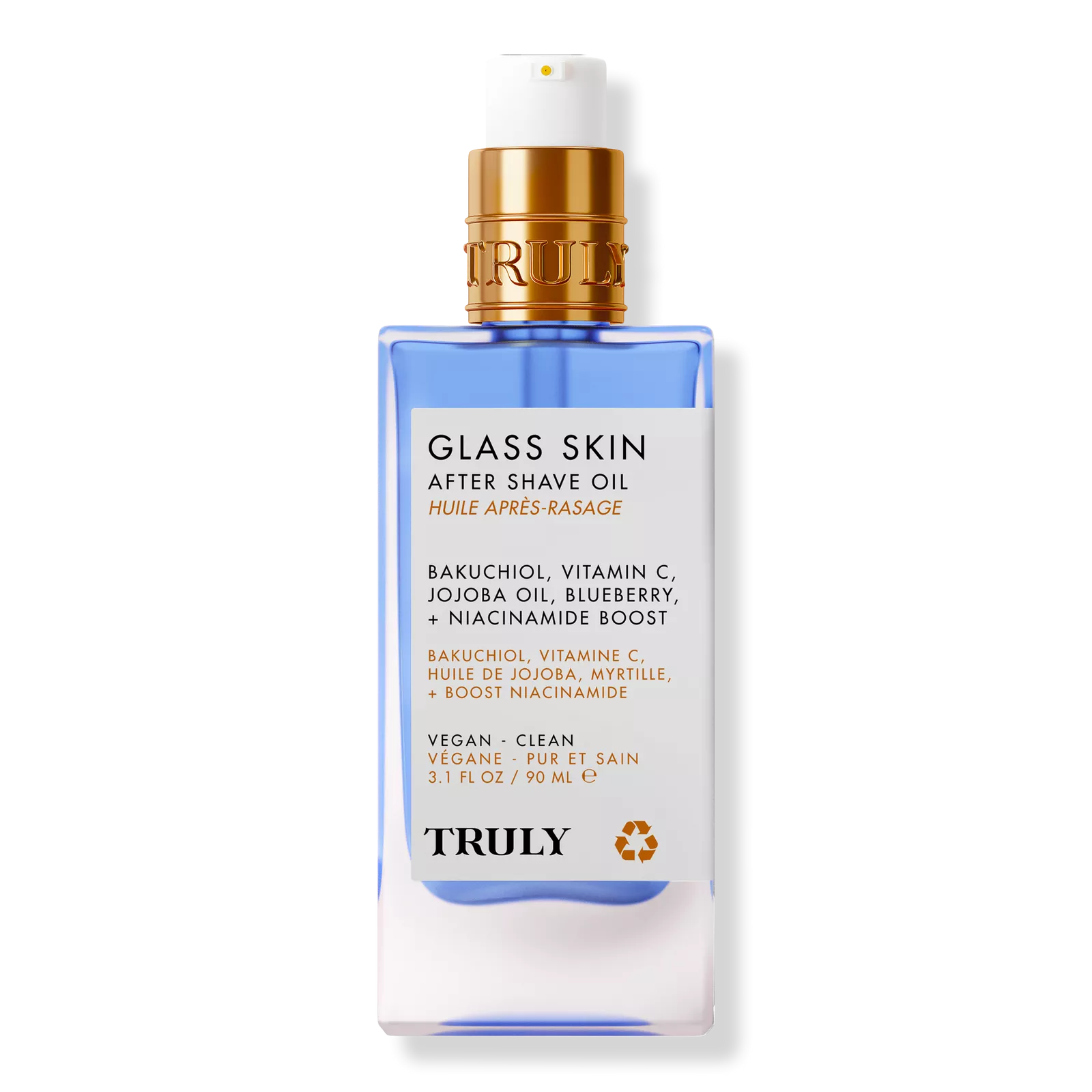 El aceite Glass Skin After Shave de Truly está diseñado para darle una piel suave y vítrea al dirigirse a poros grandes, vellos encarnados y protuberancias de navaja para un aspecto naturalmente con aerógrafo.