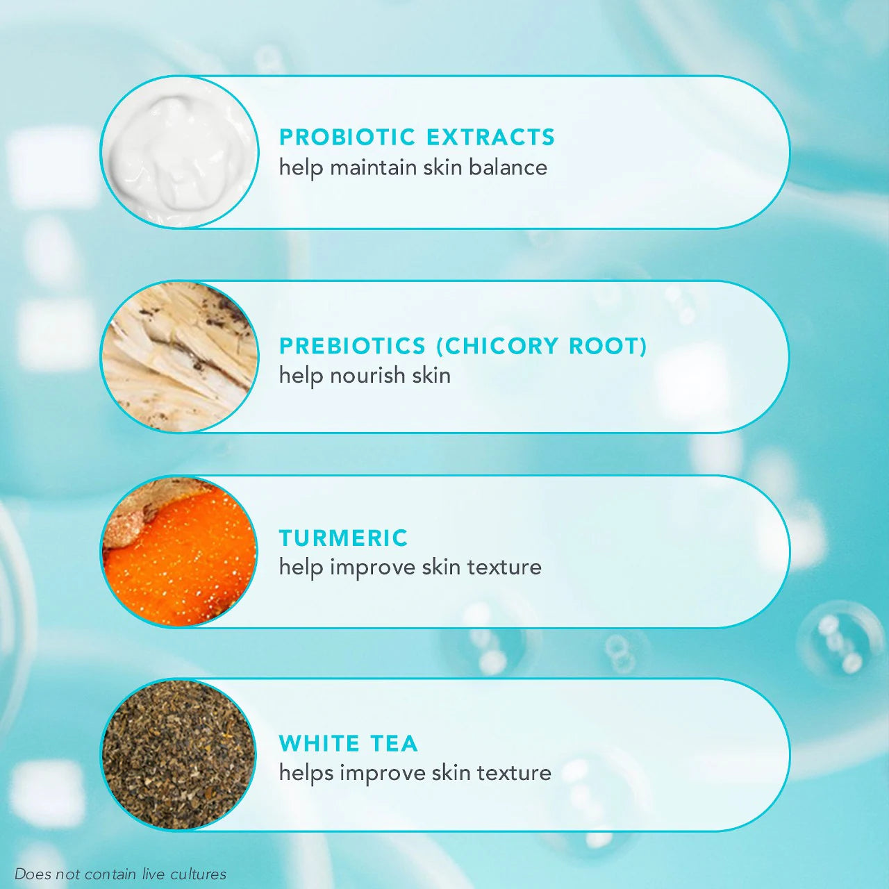 Qué es: Un limpiador a base de gel infundido con extractos probióticos, cúrcuma, té blanco y arándanos que purifica la piel a medida que elimina la suciedad, el aceite, las impurezas y el maquillaje.