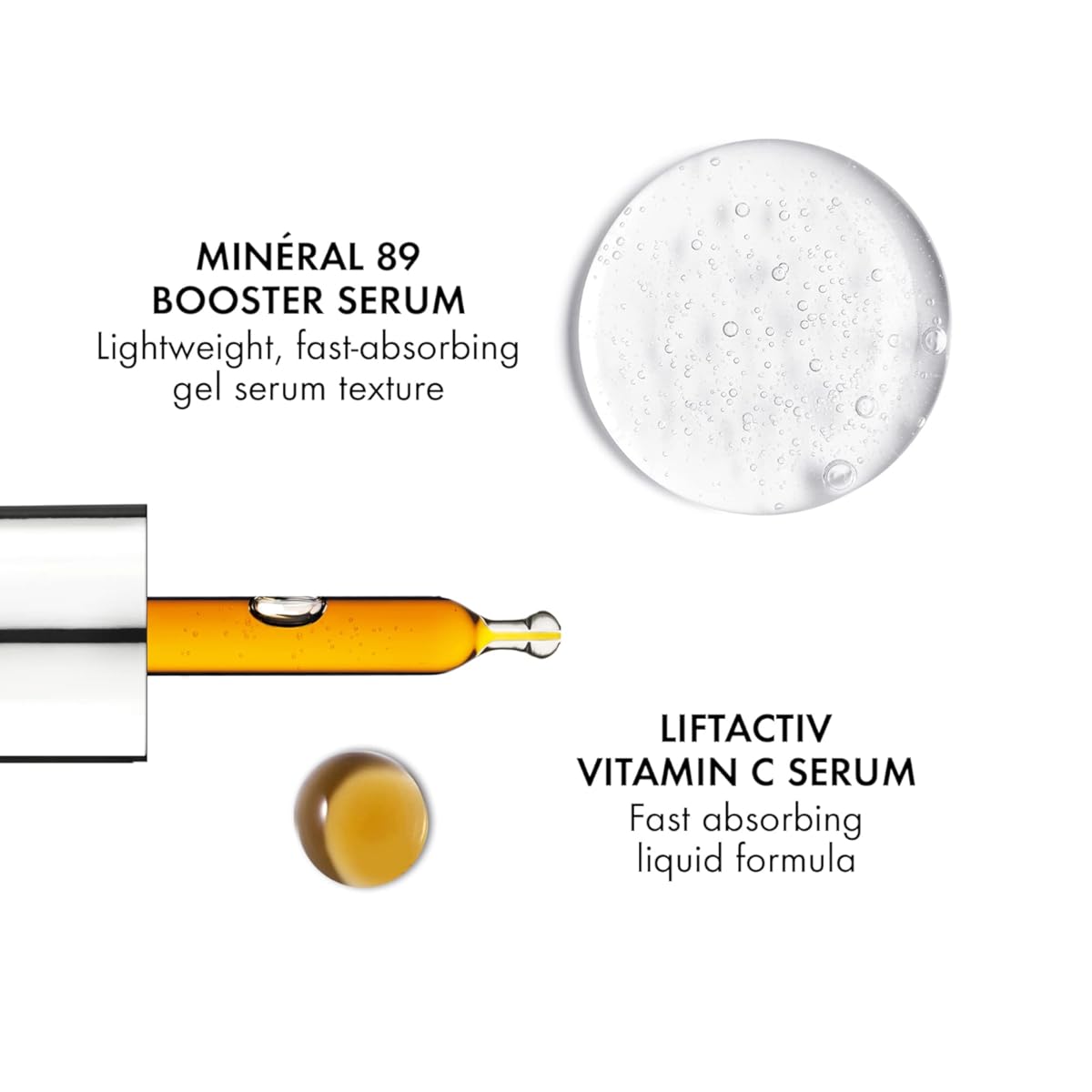 - 16% de vitamina C pura, vitamina E, carnosina, ácido hialurónico y agua volcánica de Vichy para aumentar la luminosidad de la piel y suavizar las líneas finas